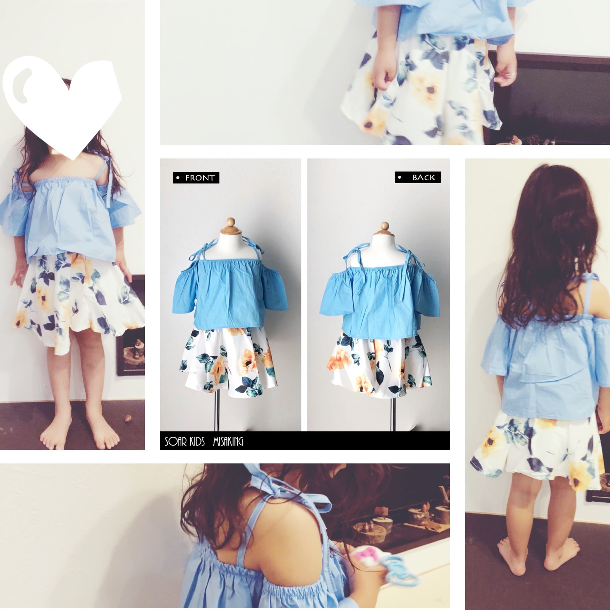 オフショルダー青のトップスと花柄が可愛いスカートのセットアップです!春夏に女の子におススメです(^^)
