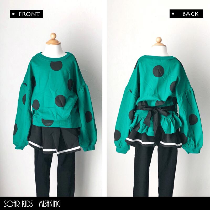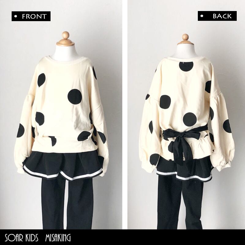 ドット柄のトップスと、スカート付きレギンスパンツの可愛いセットアップです!