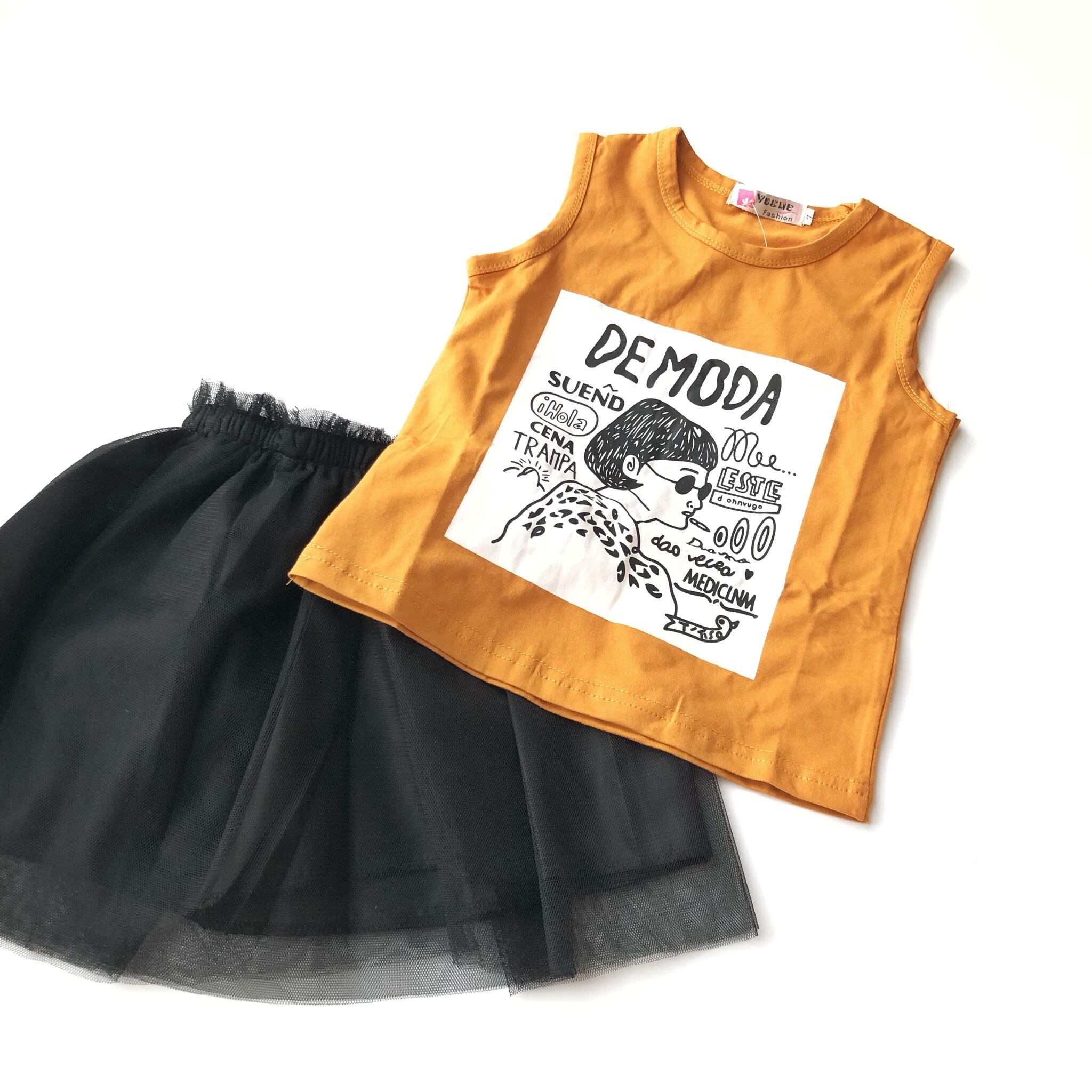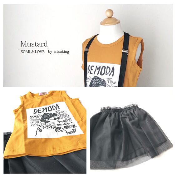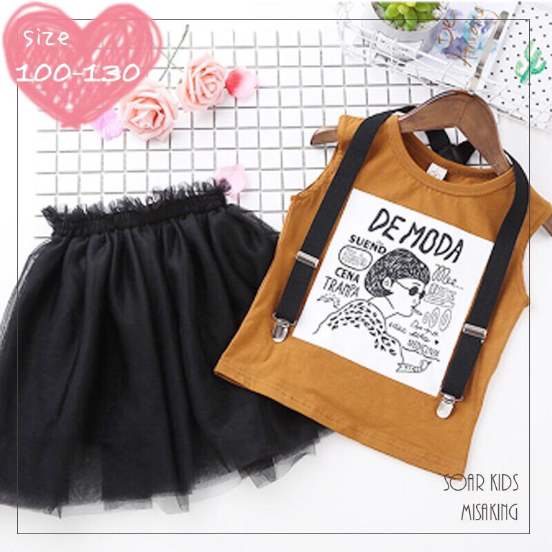ガールズプリントのトップスと、チュールスカート、サスペンダーの3点セットです♡