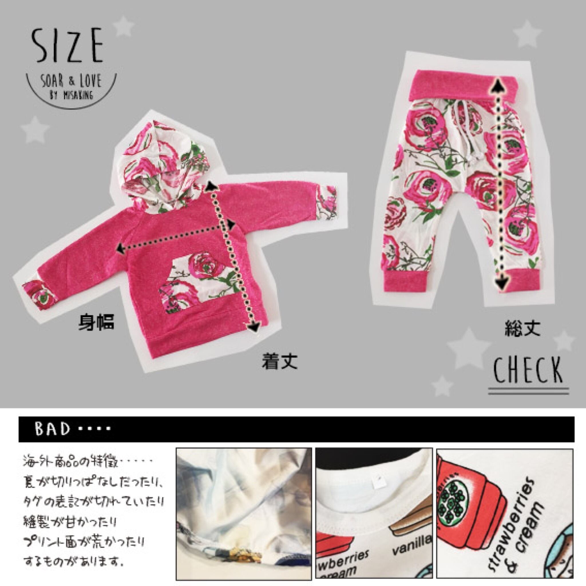 80 着丈 約31、身幅 約27、袖丈 約30、パンツ総丈 約54