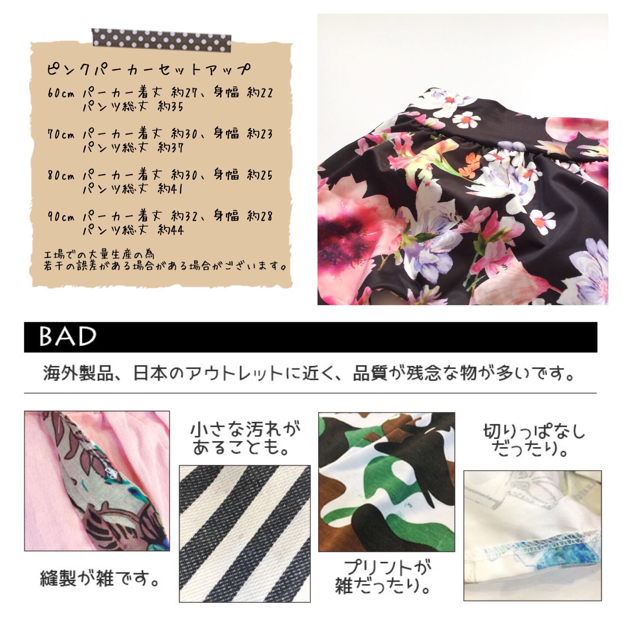 ・縫製が甘いです。ボタンやモチーフの縫い付け、取り付けが甘かったりもします。